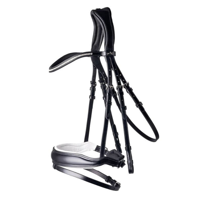 Ogłowie skórzane z nachrapnikiem szwedzkim firmy Schockemohle Stanford Wide Black/White opiera się na bestsellerowej uzdzie Stanford i ma szersze części policzkowe i szersze części boczne. Uzda z anatomicznie ukształtowanym, specjalnym nachrapnikiem posiada unikalny nagłówek, który został specjalnie dostosowany do anatomii konia. Pozwala koniowi na nieograniczoną zabawę uszami podczas noszenia. Zmniejszając nacisk w wrażliwych obszarach, takich jak kości policzkowe i szyja, komfort konia jest znacznie zmaksymalizowany. W zestawie znajdują się dwie opaski na głowę: prosta skórzana opaska i wąska jednorzędowa opaska z kryształkami.