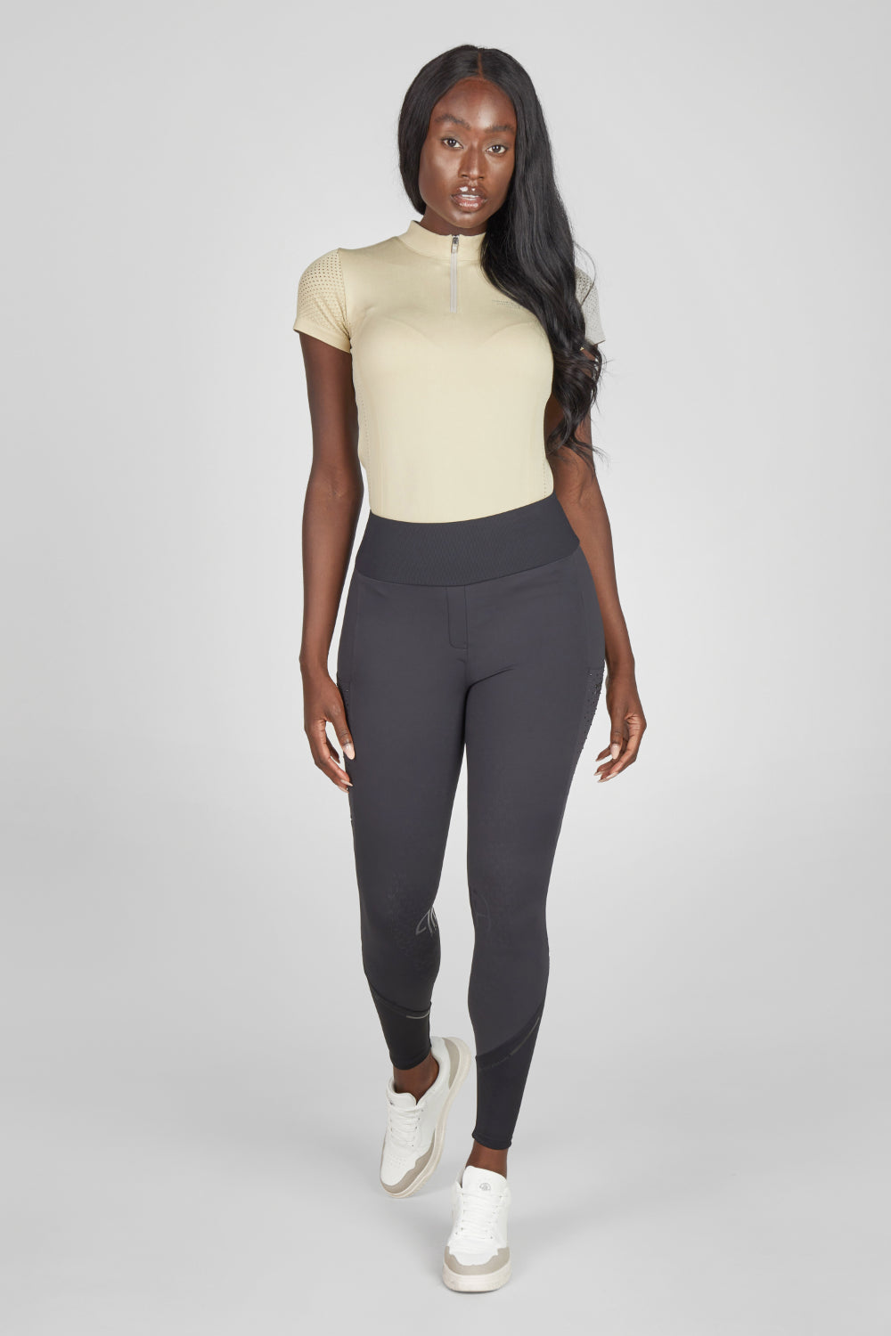 Anatomiczne profilowanie pasa i paneli udowych minimalizuje uciski w pozycji półsiadu oraz przy pracy na drągach i skokach. Krój dopasowuje się do kobiecej sylwetki, podkreślając linię nóg i jednocześnie pozostając w pełni funkcjonalny. Subtelne logo oraz klasyczna czerń sprawiają, że bryczesy pasują do fraka, marynarki konkursowej i stroju treningowego.