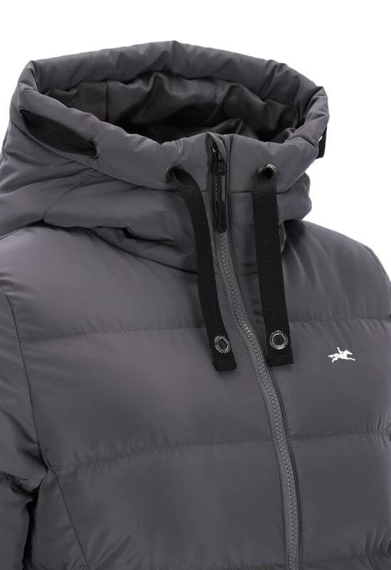 Stylowe lamówki w tonacji kolorystycznej, naszywka z logo na rękawie i haftowany motyw konia na piersi podkreślają jeździecki charakter kurtki. Regulowany kaptur z szeroką listwą i możliwością zapięcia na zatrzask chroni przed wiatrem i zapewnia dodatkowy komfort.